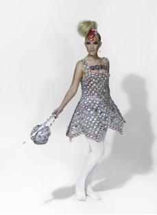 Bild 2: Bier muss sein: Das Designerduo Chainreaction hat über 1000 Kronkorken zu einer Robe verarbeitet. Die passende Tasche gibt's auch dazu.