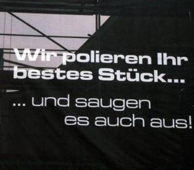 Der nächste Automat kündigte mit einem grossen Schild an: "Diese Maschine liefert das, was Männern am dringensten brauchen, wenn sie von ihren Frauen getrennt sind - 50 Cents". Der Vertreter sah sich um - niemand zu sehen - steckte 50 Cents in den Automaten, öffnete die Hose und steckte voller Vorfreude seinen Schwanz in die Öffnung. Als die Maschine anfing zu arbeiten schrie der Mann wie unter großem Schmerz. Als die Maschine 15 Seunden später stoppte konnte der Vertreter nur zitternd und mit Mühe seinen Schwanz aus der Maschine ziehen, ein Knopf war sauber am Ende des Schwanzes angenäht!