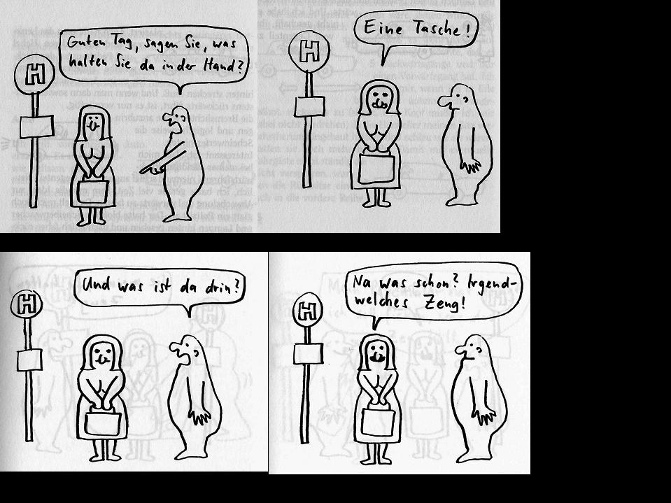 Der Herr Graf hat den Verdacht, dass seine Frau in betrügt. „Friedrich“, sagt er zu seinem Diener, „ich werde für einige Tage verreisen, und in meiner Abwesenheit wirst du in den Park gehen, dich auf die große Eiche setzen und von dort das Treiben meiner Frau beobachten. Führe bitte ein Protokoll.“
