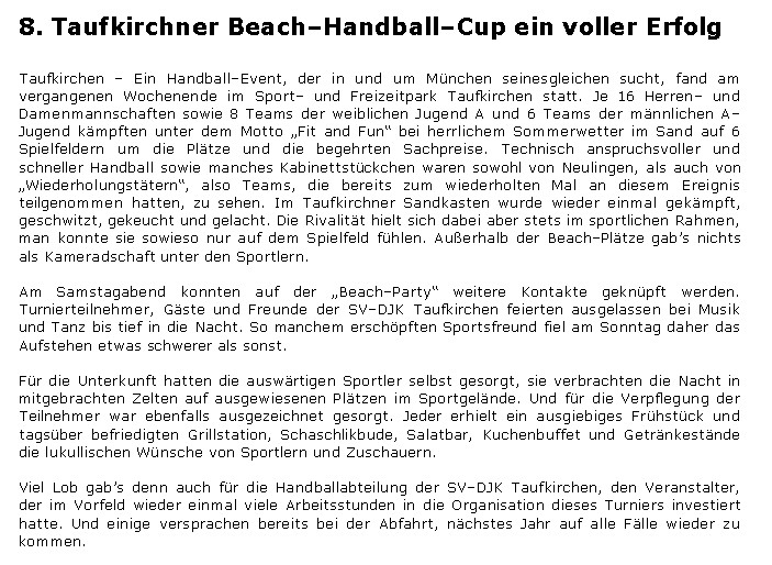 Da die Teilnehmerzahl auf 32 Mannschaften begrenzt ist, heißt es: schnell anmelden und dabei sein, beim Taufkirchner Beachhandball-Turnier 2005!