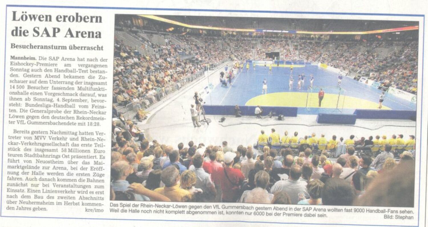 Bis zuletzt wurde gearbeitet - der Handballboden ist verlegt. Am heutigen Mittwoch (19.30 Uhr) steigt die Handballpremiere in der Mannheimer SAP ARENA. Nach dem Testlauf der Adler Mannheim proben nun auch die Rhein-Neckar Löwen und haben sich dafür keinen geringeren Gegner als den deutschen Rekordmeister VfL Gummersbach ausgesucht. Die Rheinländer kommen mit Stars wie Kyung-Shin Yoon, Francois-Xavier Houlet und Frank von Behren in die neue Multifunktionsarena nach Mannheim.