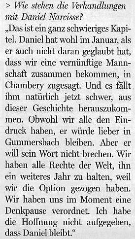 Krämer erzählt viel, wenn der Tag lang ist. Was Sacharow für ein Bomber ist, das habe ich noch im Ohr. Da steht auch nichts davon, daß Narcisse nicht nach Chambery will. Da steht, daß er "wohl" in Chambery unterschrieben hat, weil er glaubte, der VfL bekommt keine gute Mannschaft zusammen. Das steht, daß "alle den Eindruck haben" er "würde" lieber bleiben. Da steht keine Silbe davon, daß er das geäußert hat.