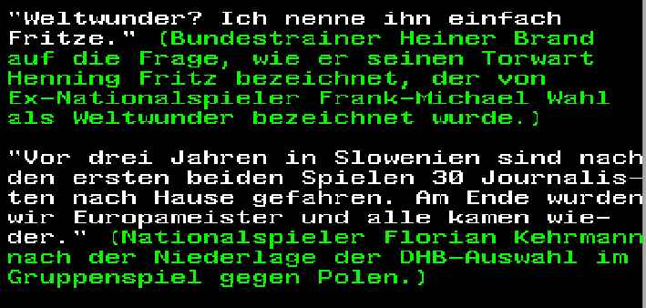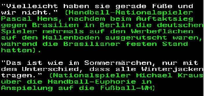 • Ich krieg den genauen Wortlaut nicht hin, aber auf die Frage eines Reporters, wie sich wohl Heiner Brand jetzt fühlt antwortete der Marcus so ungefähr.... also der ist ziemlich bedrückt, wir müssen jetzt erst mal sehen wie wir ihn wieder aufbauen weil er grade den Weltmeistertitel geholt hat... und ähnliches in die Richtung. :lol: