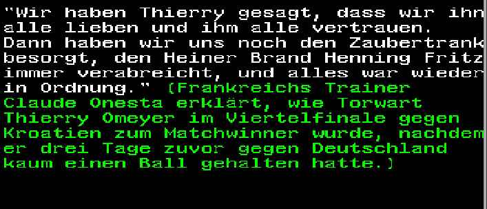 • ich fand ja zeitzis zettel nach dem sieg gegen frankreich im halbfinale genial: "suche zwei karten fürs finale!" und dabei hat er nur schelmisch gegrinst