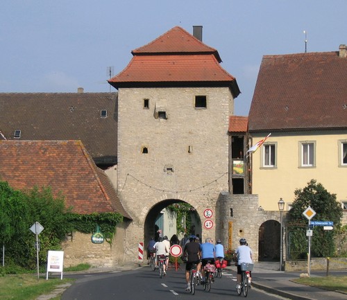 • Wir sehen ein Tor in einer Wehrmauer aus dem 15./16. Jahrhundert in einem Dorf, das sich im selben Landkreis befindet wie obige Kirche (ein Stück Main-aufwärts).