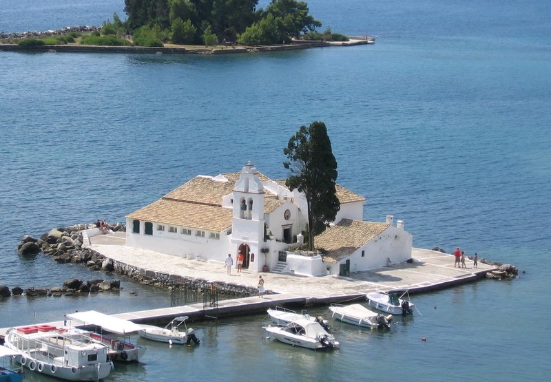 Das ist die Klosterinsel Vlacherna vor der griechischen Insel Korfu - direkt in der Einflugschneise des Flughafens!