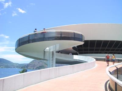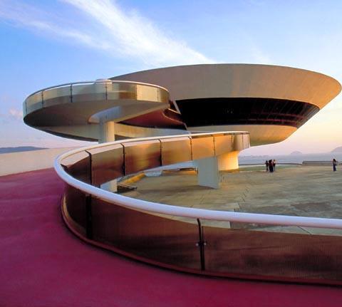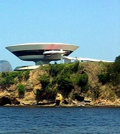 Es ist das Museum für zeitgenössische Kunst in Niterói, Brasilien. Niteroi liegt an der Guanabara-Bucht direkt gegenüber von Rio de Janeiro und das von Oscar Niemeyer entworfene Museum steht auf einer Klippe mit Blick aufs Meer.