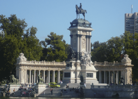 Das ist das Monument von Alfons XII. von Spanien im Parque del Buen Retiro in Madrid, Spanien. Alfons XII. war von Dezember 1874 bis zu seinem Tod im Novemeber 1885 König von Spanien.
