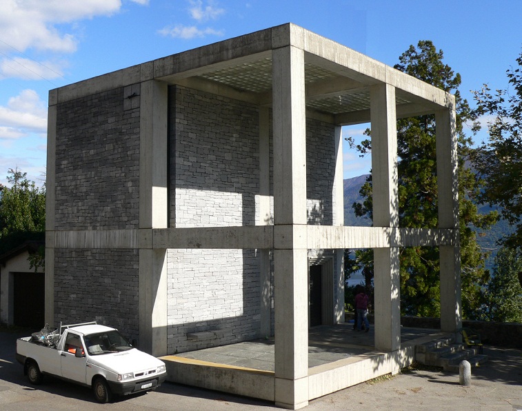 In Porta, hoch über Brissago mit traumhaftem Blick über den Lago Maggiore. Kubus, Würfel, quadratischer Grundriss, eine Hälfte des Quadrats ist der Feierraum, die andere Hälfte ist der überdachte Portikus. Innen Sichtbeton. Die Bänke an der Wand. Beleuchtung durch drei hochliegende Öffnungen. Für die Stimmung in der Kirche zitiert der Architekt einen Satz von Tadao Ando: „Der Geist erneuert sich im Halbschatten.“