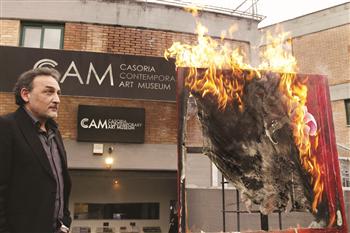 Das Museum leidet sehr stark unter den Sparmaßnahmen der italienischen Regierung. Der Museumsdirektor hat deshalb bei Angela Merkel Asyl für sein Museum beantragt. Da sie bisher noch nicht geantwortet hat, beginnt er jetzt ein Bild nach dem anderen zu verbrennen. Das erste musste schon dran glauben, was gestern bei uns in den Nachrichten gezeigt wurde.