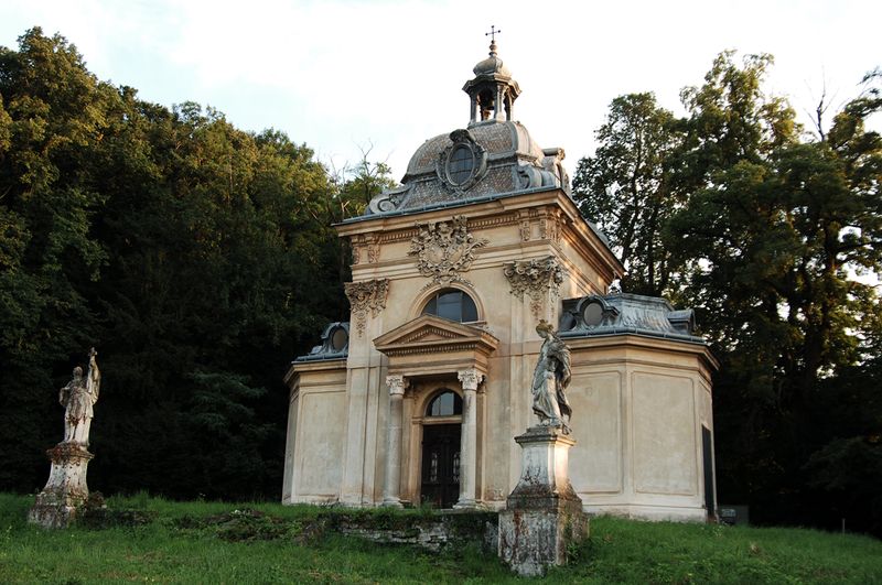 Jetzt hab ich lange genug gesucht. Vermutungen: Spätbarock, Kapelle, Gartenhaus, Begräbnisstätte, im Park/Garten einer größeren Anlage. Das schlimmste ist, ich würde nicht mal schwören wollen, dass ich das Ding noch nicht aus der Nähe gesehen hätte..