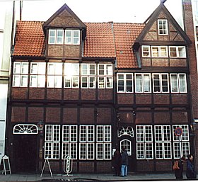 Krameramtsstuben in Hamburg. Wenn an durch den Ganz links geht kommt man u.a. zum Restaurant, kann eine Wohnung besichtigen und seine Teesammlung aufbessern.