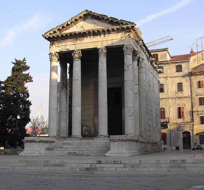 Augustus-Tempel in Pula (Istrien) auf dem Platz der Republik, auch Forum genannt. Errichtet im 1. Jahrhundert n. Chr. zu Ehren des Kaisers Augustus und der Göttin Roma.