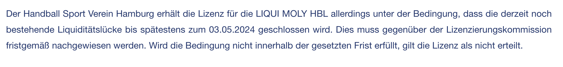 HSVH erhält Lizenz für Saison 2024/25 – muss aber noch eine Bedingung erfüllen | Handball Sport Verein HamburgDie Lizenzierungskommission der Handball-Bundesliga hat am Mittwoch entschieden, dass der Handball Sport Verein Hamburg auch in der Saison 2024/25 in der LIQUI…hamburg-handball.deHoffen wir mal, dass dem so ist und das Thema Anfang Mai vom Tisch ist.