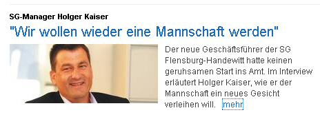 Der neue Geschäftsführer der SG Flensburg-Handewitt hatte keinen geruhsamen Start ins Amt. Zu den ersten Aufgaben von Holger Kaiser gehörte es, in harten Verhandlungen mit Präsidium, Beirat und Spielervertretung eine Gehaltskürzung für die Profis durchzusetzen. Im Interview mit unseren Redaktionsmitgliedern Hans-Werner Klünner und Jan Wrege erläutert Kaiser, wie er die SG durch schwierige Zeiten steuern und der Mannschaft ein neues, stärker regional geprägtes Gesicht verleihen will.