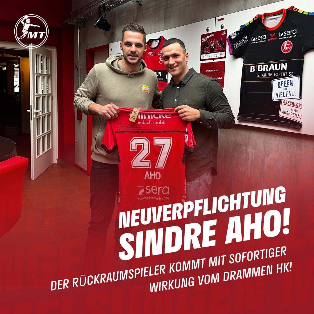 "Der 26 Jahre alte Mittelmann wechselt ablösefrei vom norwegischen Tabellenführer Drammen HK an die Fulda. Bei der MT soll er vor allem Spielmacher Erik Balenciaga entlasten. Aho erhält einen Vertrag bis zum Saisonende mit einer Option auf Verlängerung."