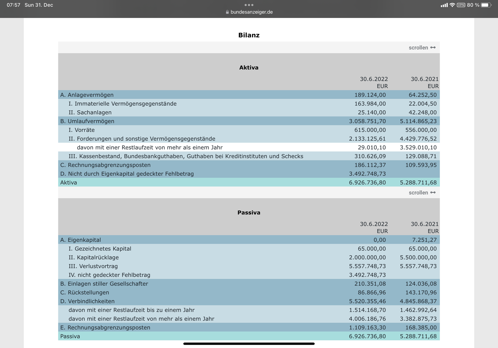 Von Aktiva und Passiva auf wirkliche finanzielle Situationen zu schließen ist aber Heikel. Schließlich gibt es mehrere Gesellschaften für Spielbetrieb, Verwaltung, Halle etc. wie dort was hin und hergeschoben wird ist für uns nicht ersichtlich.