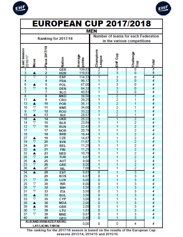 Wieso probiert es Melsungen nicht?Haben die aufgelisteten Teams gemäß EHF Ranking einen Startplatz in der CL sicher? Denke da an Teams wie Cocks aus Finnland...