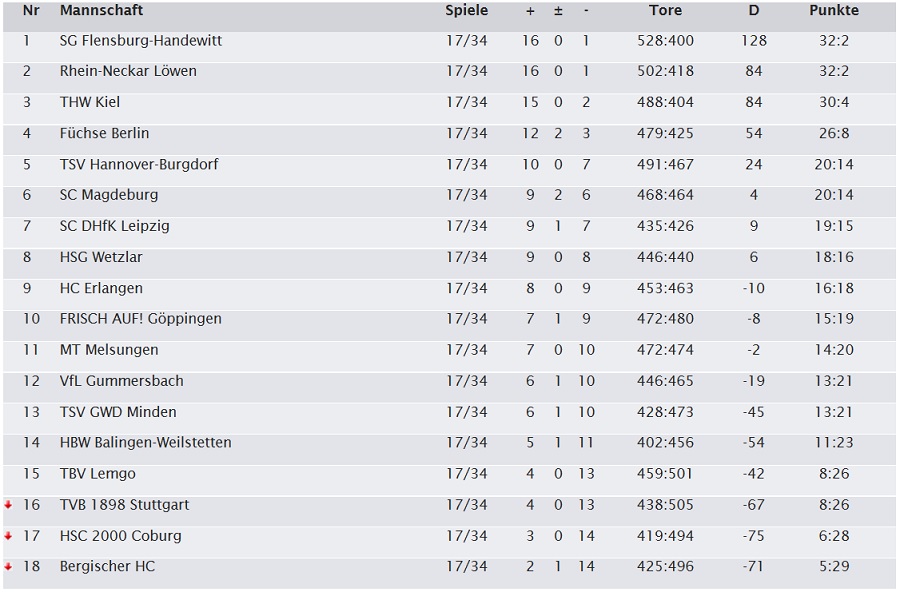 Vorne der erwartete Dreikampf um die Meisterschaft. Die SG Flensburg-Handewitt hat den Vorteil in der Rückrunde sowohl den THW Kiel als auch die Rhein-Neckar Löwen noch in eigener Halle empfangen zu dürfen, aber mögliche Auswärtsstolpersteine in Melsungen, Berlin, Leipzig oder Magdeburg könnten die Meisterschaft gefährden.
