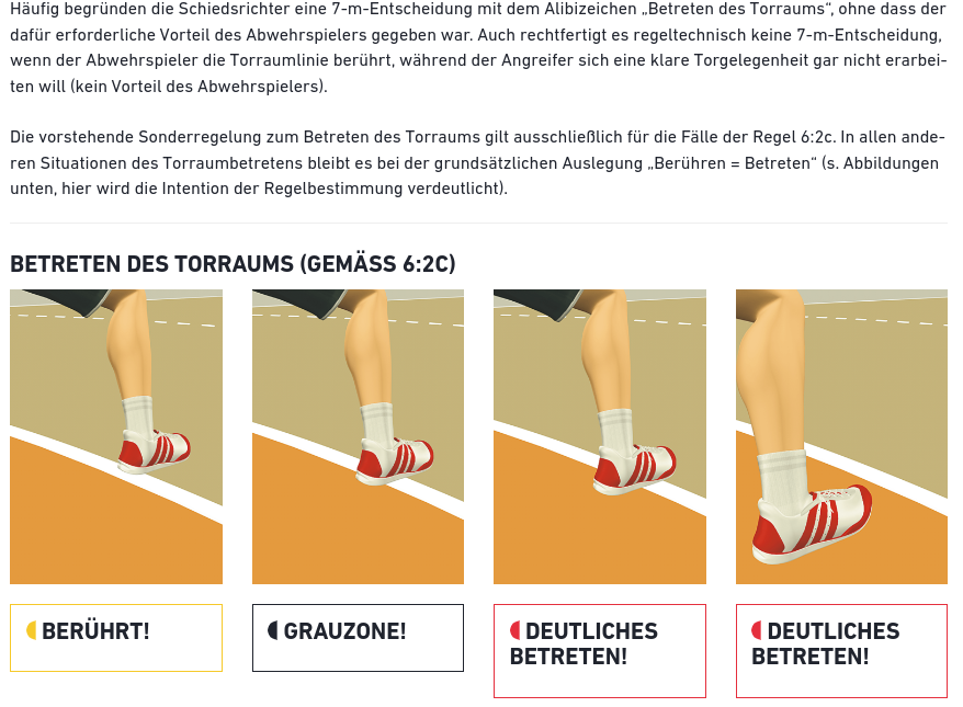 Aber für Abwehr durch den Kreis muss ein Abwehrspieler mit mindestens einem Fuß deutlich im Kreis sein. „Deutliches Eintreten“ steht im Regelheft.
