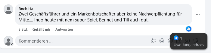 Der Kader(bisher) für nächste Saison macht mir ein wenig Angst....... gefühlt alle bisherigen Abgänge eher schlechter besetzt. Schön dass man vermehrt auf eigene Spieler setzt, es nun sollten noch 2-3 richtige Kracher geholt werden.