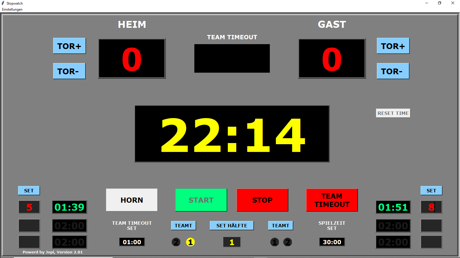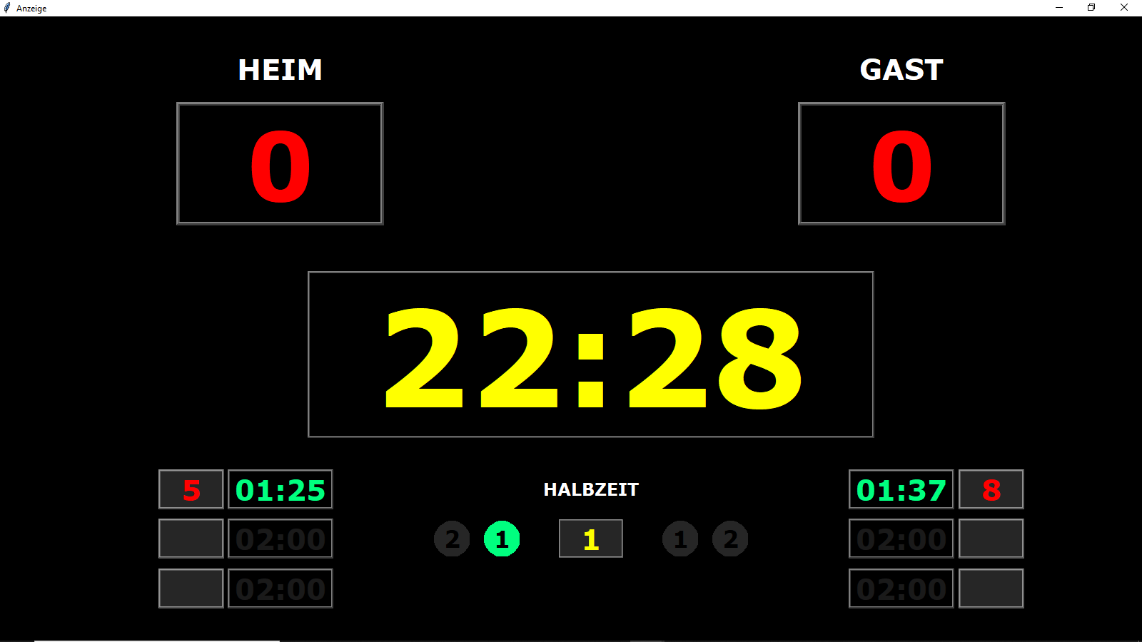 • Biete Anzeigesoftware für Spielstandanzeige mit 3-fache Anzeige von 2-Minutenstrafen mit Spieler-Nr., Team-Timeout, Signalhorn bei Ablauf der Spielzeit / Team-Timeout, Voreinstellung der Spielzeitdauer, Dauer des Team-Timeout, etc.... Programmiersprache Python, selbständig lauffähige EXE-Datei benötigt keine weitere Software, lauffähig auf allen gängigen Windows-Rechner, 64 bit. muss nicht installiert werden. Funktionen selbsterklärend. Anzeige auf zweiten Bildschirm, Beamer, LED-Panel etc... Bei Interesse E-Mail an jopi.borken@gmail.com. Das alles ist kostenlos.