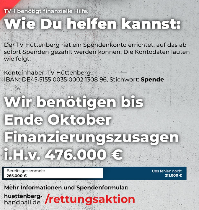 Aber im aktuellen Fall in Hüttenberg kommt die Meldung bereits nach dem 5. von 34 Spieltagen, dass man in ca 25 Tagen über 200.000 Euro einsammeln muss, sonst müsse man in nicht Mal 4 Wochen Insolvenz anmelden.