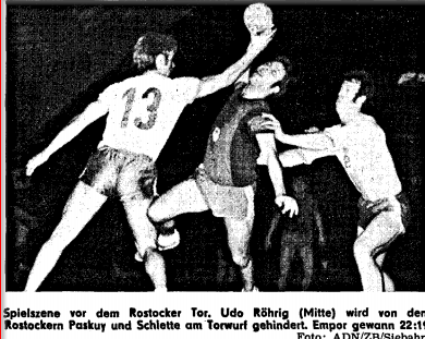 ZitatDie Magdeburger konnten in diesem Spitzenspiel nur auf ein erfolgreich gestaltetes Duell verweisen: Heinz Flacke warf mit neun Toren eins mehr als der beste Rostocker, Kapitän Rainer Ganschow.