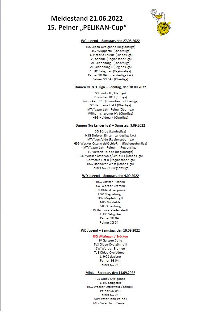 aus der Eule wird der Pelikan ... in der nunmehr 15. Auflage der Veranstaltung nimmt nun erstmalig unser Vereins-Wappentier seinen Platz im Namen des Turniers ein - aus der Eule wir der Pelikan ! Ansonsnten hoffen wir im Rahmen der in diesem Jahr erstmalig sechs (in Zahlen : 6) Turniertage, auch anlässlich des Jubiläums "100 Jahre Handball in Peine", weiter die bei uns gewohnte Qualität auf allen Ebenen bieten bzw. uns sogar noch steigern zu können.