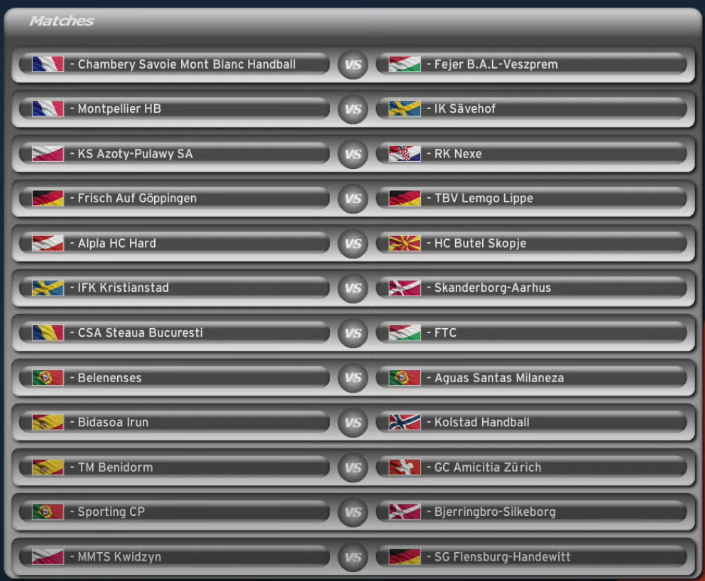 • Das Lemgo-Duell kommt mir neben dem norwegischen am ausgeglichensten vor in der ersten Runde. Ev. auch Cocks gegen den portugiesischen Vertreter, ohne großartig etwas über die zu wissen, darf man ja annehmen das eine Quali für diesen Wettbewerb aus der portugiesischen Liga heraus mittlerweile was heißt.