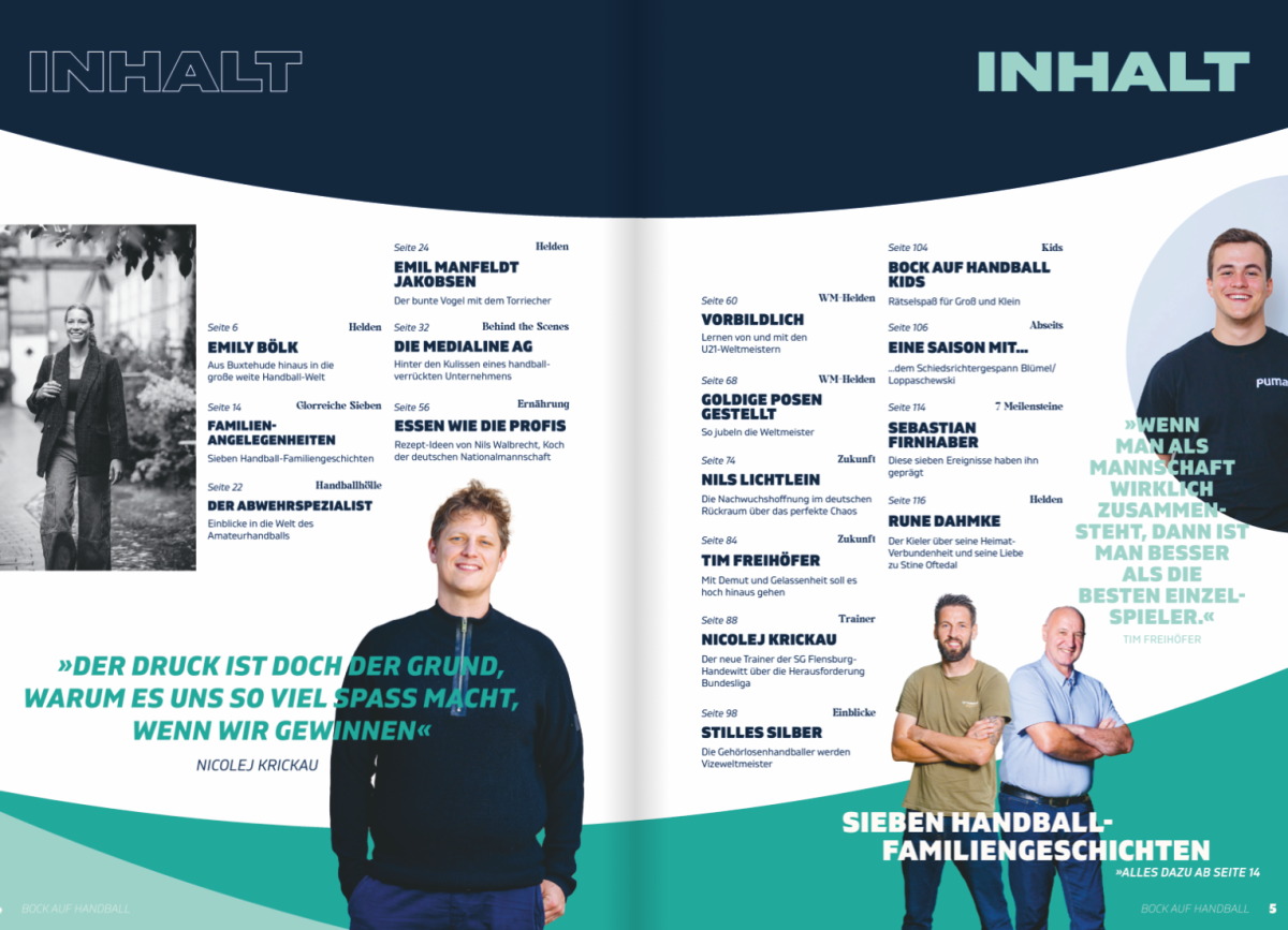 In der nächsten Woche erscheint die mittlerweile zwölfte Ausgabe von "Bock auf Handball". Dieses Mal stehen echte Handball-Familien im Fokus. Die Redaktion hat sich beispielsweise mit Emily Bölk und Mama Andrea und beispielsweise auch mit Bennet Wiegert und Papa Ingolf getroffen. Auch Rune Dahmke und Stine Oftedal gaben Einblicke in ihr gemeinsames Leben. Zudem berichten die U21-Weltmeister wie sie während ihrer gemeinsamen Zeit auch so etwas wie eine Familie geworden sind.