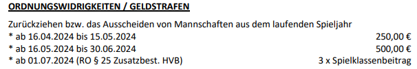 Es wird schon kniffelig. "Während der Meisterschaftssaison". Die hat noch gar nicht begonnen (§ 9 I SpO DHB). Oder ist nur Ausscheiden während der Meisterschaftssaison gemeint, Zurückziehen bereits nach Meldung? Kann man so auslegen, dann ist ja der Bescheid noch o.k. Andererseits folgt auf die Meldung mancherorts noch ein Staffeltag und danach die Ligeneinteilung. Zwischen Meldung und Ligenteinteilung wäre noch gar kein organisatorischer Schaden entstanden, so dass die Auslegung "Zurückziehen während der Meisterschaftssaison" noch plausibler erscheint.