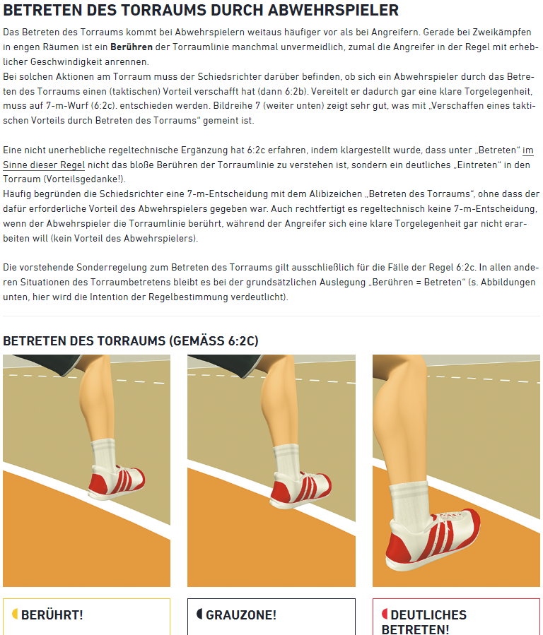 Hier einfach nochmal die ganze Szene von den letzten 40 Sekunden des Spiels Slowenien gegen Dänemark. Und zu der Frage, wann es ein Betreten des Torraums nach Regel 6:2 c) ist hier mal der Auszug aus dem SR-Portal. Und ich habe mal dazu noch das Beispiel beigefügt, was zu beachten ist, wenn der Abwehrspiele bei der Abwehr in den Torraum gedrängt wird.