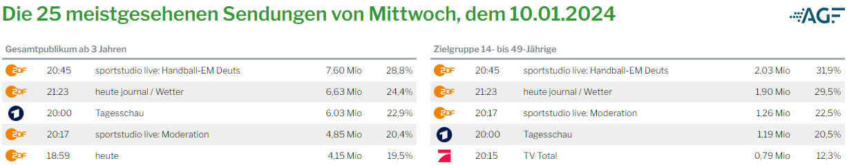 Zu den TV-Quoten: 3/4 der Zuschauer waren 50+. Unstreicht leider wieder den Stellenwert von Profihandball bei den Jüngeren.