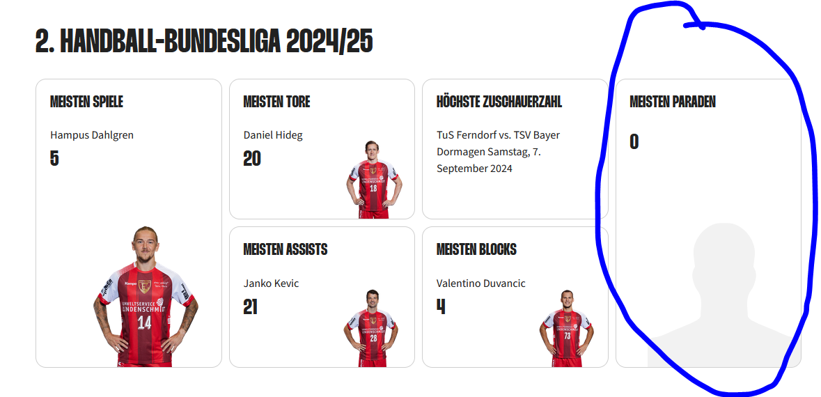 Juri Knorr, eines der großen Aushängeschilder der Liga, hat bisher (wie viele weitere!) kein Portrait auf der HBL-Seite. Bei etlichen Spielern steht "Gewicht = 0, Größe = 0, Nationalität = Keine Angabe. Bei manchen Spielern steht im Profil nicht mal der Name sondern nur ein Code.