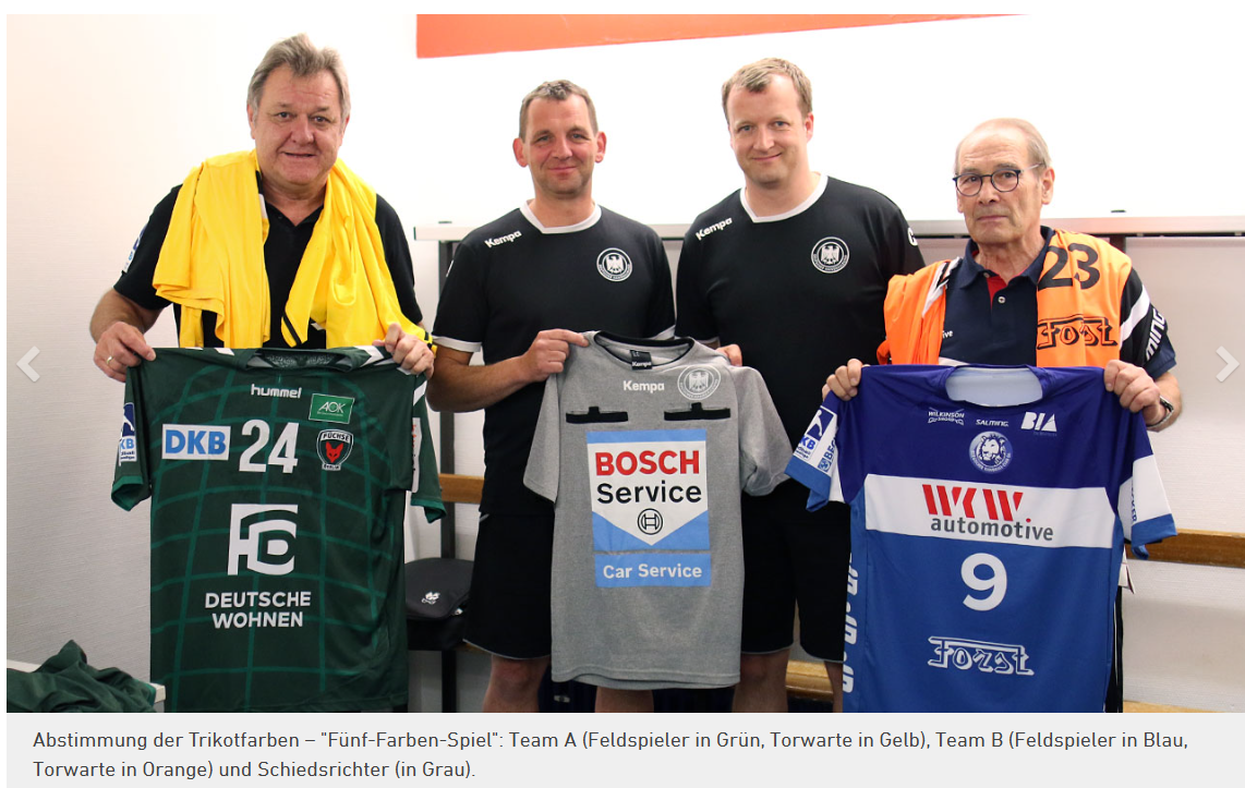 • Es gilt eigentlich immer noch das "Fünf-Farben-Spiel". (4:7-4:9, 17:3). Hier mal ein Beispiel aus dem Schiedsrichterportal, wie es eigentlich richtig sein sollte. Aber das müssen die Schiedsrichter entscheiden, dazu sind sie nach Regel 17:3 angehalten, dass auch die Trikotfarben passen. Wobei hier aber auch nur zwischen Feldspieler der Mannschaften und Torwarte beider Mannschaften und Unterschied Farbe Torwart und Feldspieler eigene Mannschaften besonders eingegangen wird. Es sollte aber eigentlich klar sein, dass die Schiedsrichterfarbe neutral sein sollte. Aber das ist leider nicht selten zu sehen. Auch nicht nur im Handball.