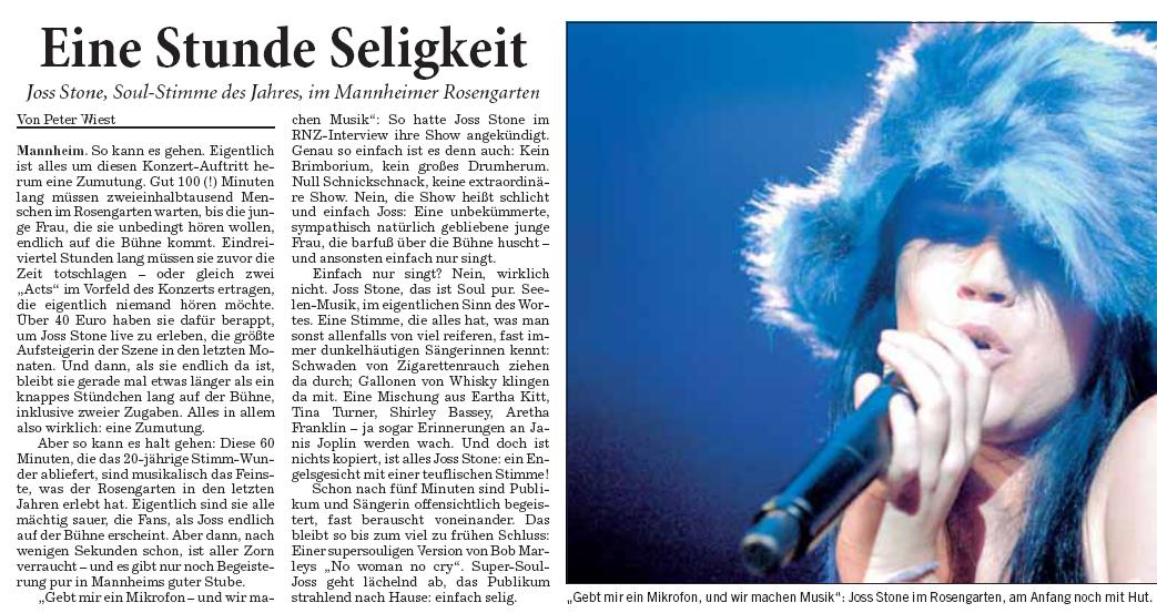 War leider nicht dort, weil meine Karre wieder gestreikt hat - aber die Kritik war nicht grade gut - wobei die Frau echt ne begnadete Musikerin ist. Wäre gerne hin .... anbei der Zeitungsbericht der Rhein-Neckar Zeitung