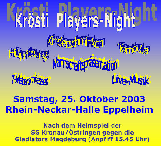 Nach dem Spiel gibt es eine Players Night! Unter anderem wird in der Halle eine Hüpfburg aufgebaut, Kinder werden geschminkt, ihr könnt gegen unsere Bundesliga Goalies 7 Meter werfen, es wird die Mannschaft vorgestellt, eine Live Band ist am Start, Party wird organisiert von der Nachtschicht und 8 Grad! Wird alles noch ne Nummer Fetter als gegen Düsseldorf! Also bringt gute Laune mit und vor allem schönes Wetter!