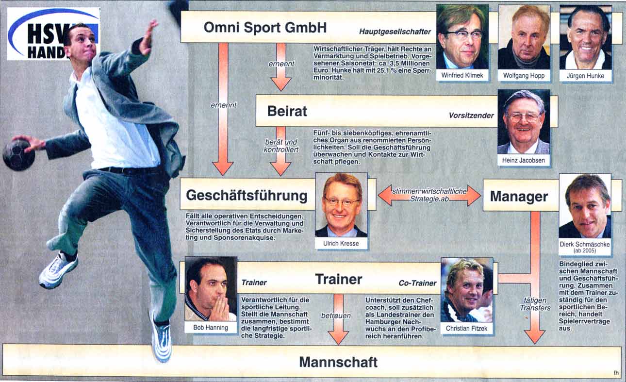 Die sportliche Ebene bleibt von den Rochaden weitgehend unangetastet. So wird Schmäschke seine Beratertätigkeit für den Verein neben seiner Lehrertätigkeit fortsetzen, bevor er 2005 als Manager hauptamtlich beim HSV einsteigen soll. Bis dahin will sich der frühere Geschäftsführer der SG Flensburg-Handewitt, der vergangene Saison die Preisoffensive für Dauerkarten initiiert und den "Platinumclub" als Sponsorenplattform ins Leben gerufen hat, weiter im Zusammenspiel mit Trainer Bob Hanning "sportlich-beratend" einbringen.