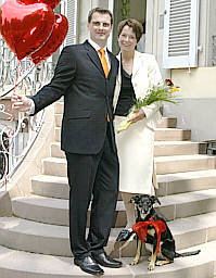Ne, Spaß beiseite. In Leverkusen ist der Hund genauso wie der von Renate Wolf immer in der Halle dabei, springt nach dem Spiel immer übers Feld oder durchs Foyer. Ist zwar etwas ungewöhnlich, ein Tier mit aufs Hochzeitsfoto zu nehmen, aber warum eigentlich nicht, wenn er eigentlich zur Familie gehört.