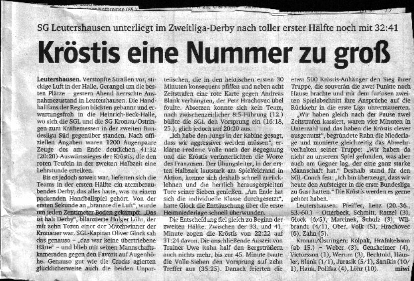Das war ein klasse Heimsieg gegen die SG Leutershausen. Da ein Derby seine eigenen Gesetzte hat denke ich sollte man über die schlechte Abwehrarbeit in der ersten Halbzeit hinwegsehen ..... was König Otto und Spiky Löhr dann zeigten war einfach Handball in Vollendeter Geilheit! GEIL GEIL GEIL!