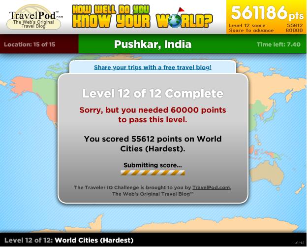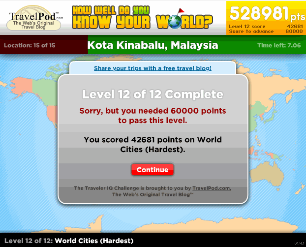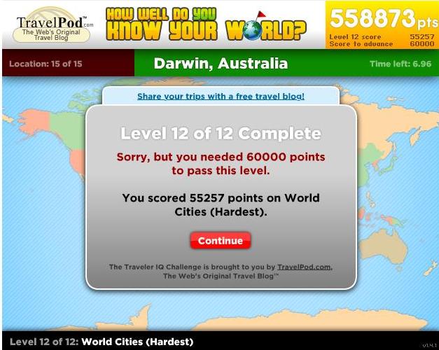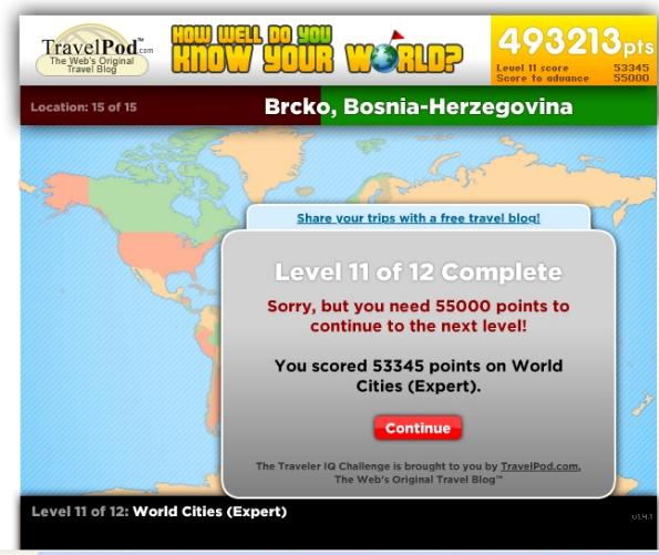 das spiel zeigt mir eindeutig, dass ich keine guten erdkundekenntinisse habe! bei mir war in level 4 mit 28400 punkten schluss, also beim 1. mal, werd es nochmal machen irgendwann!
