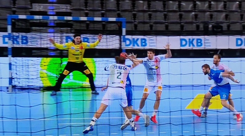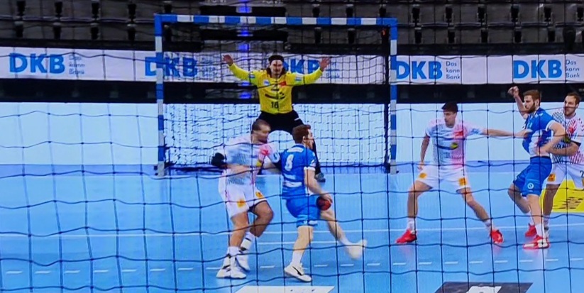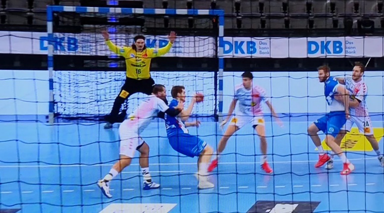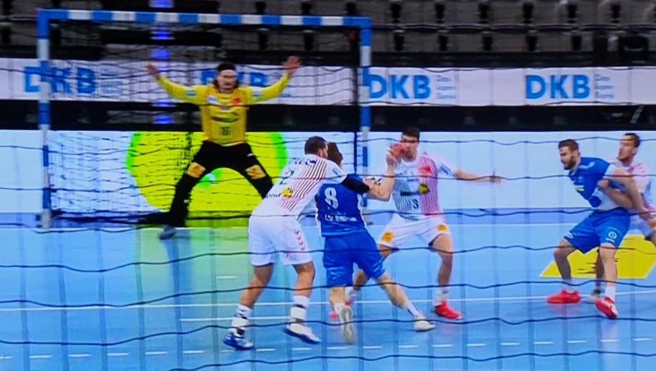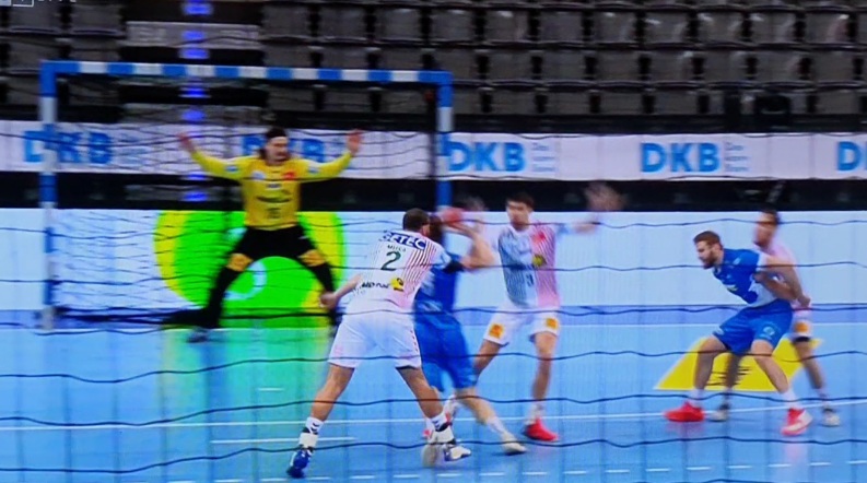ich habe mir die Szene nun wirklich mehrfach am Fernseher (Aufnahme von Sky) angesehen. Ich kann Deine Wahrnehmung auf den Fernseher leider nicht sehen. Es stimmt das Mussa Faluvegi mit der linken Hand an der Hüfte/Bauch annimmt aber auch sehr schnell durch die erste Finte nach links und die schnelle Gegegenbewegung zur Wurfhand (in Richtung Chrapek) faluvegi verliert. Ab dem zweiten Schritt (nach rechts) von Faluvegi ist er aber hinter Ihm und greift beim dritten Schritt und der Wurfbewegung voll in den Wurfarm (Oberarm) von hinten und lässt bis zum Hinfallen von Faluvegi n.M.n: nicht mehr los. Leider kann man keine Videosequenzen sonder nur bis max. 5 Fotos hier einstellen.