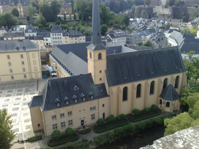 Was man sieht, ist der Blick vom Bockfelsen (oder gar aus den Kasematten) auf den Luxemburger Stadtteil Grond mit der Neumunsterabtei im Vordergrund, ehemaliges Kloster, dann bis in die 80'ger Gefängnis, heute Kulturzentrum mit Cafés, Konzerten, Künstlern. Rechts im Hintergrund noch erkennbar die Vauban-Bastion vom Heelig-Geescht-Plateau.